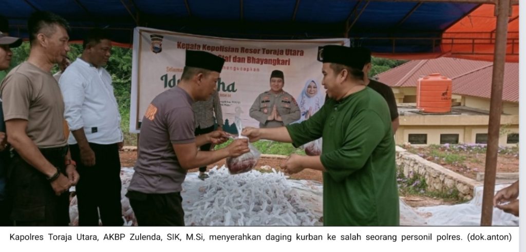 TORAJA UTARA, TransTribun.com l Pada Hari Kurban, Idul Adha 2024, Polres Toraja Utara mengorbankan 6 ekor sapi dan 1 kambing untuk dibagi ke warga masyarakat yang berhak. Kapolres Toraja Utara, AKBP Zulanda, SIK, M.Si menyerahkan langsung daging kurban ke warga. Menurut Ketua Panitia, AKP Syahrul Rajabia, ST, MH yang juga Kasat Resnarkoba Polres Torut, saat ditemui di sela acara, Senin (17/6), warga yang menerima daging kurban ini datang dengan menunjukkan kupon.
