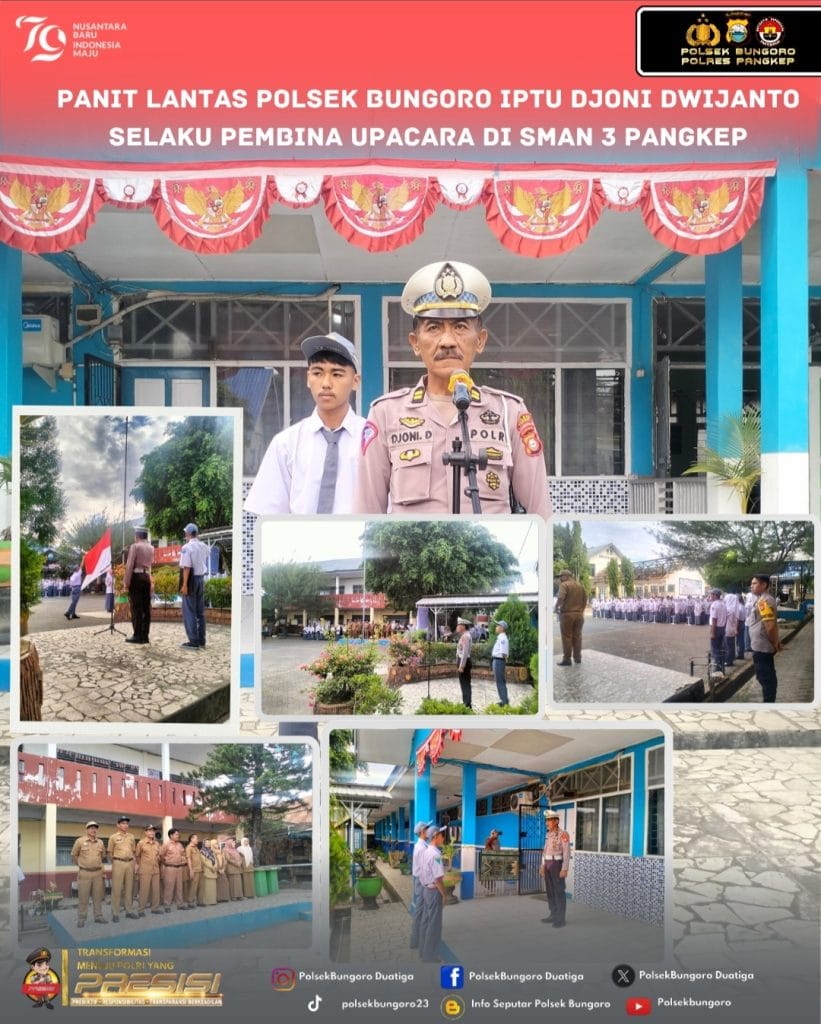 Pangkep,  – Dalam upaya meningkatkan kesadaran berlalu lintas di kalangan pelajar, Panit Lantas Polsek Bungoro, Iptu Djoni Dwijanto, menjadi pembina apel pagi di SMAN 3 Pangkep Kelurahan Samalewa, Kecamatan Bungoro, Kabupaten Pangkep. Kegiatan ini dilaksanakan pada Senin pagi, 09/09/ 24.