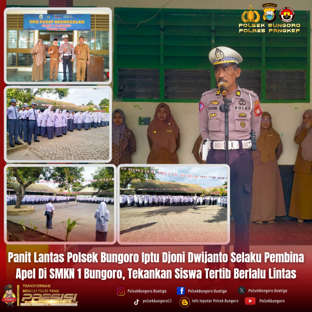 Pangkep, – Dalam upaya meningkatkan kesadaran berlalu lintas di kalangan pelajar, Panit Lantas Polsek Bungoro, Iptu Djoni Dwijanto, menjadi pembina apel pagi di SMKN 1 Bungoro, Kelurahan Samalewa, Kecamatan Bungoro, Kabupaten Pangkep. Kegiatan ini dilaksanakan pada Senin pagi, 12/08/ 24.